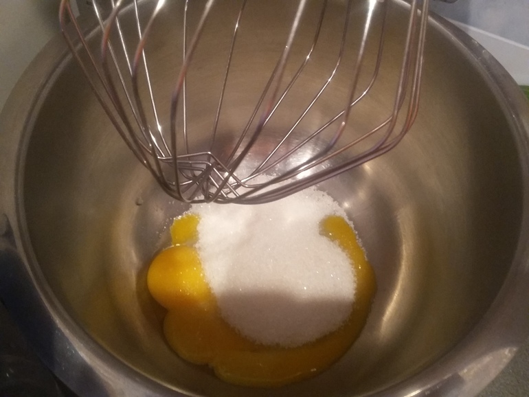 Взбить 2 желтка с 100 г сахара: