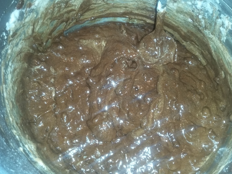 Отдельно соединить муку, разрыхлитель, соду и соль ( я пол стакана муки заменила какао порошком). Просеять эту смесь в молочную и тщательно перемешать. И оставить на 15 мин тесто постоять.
