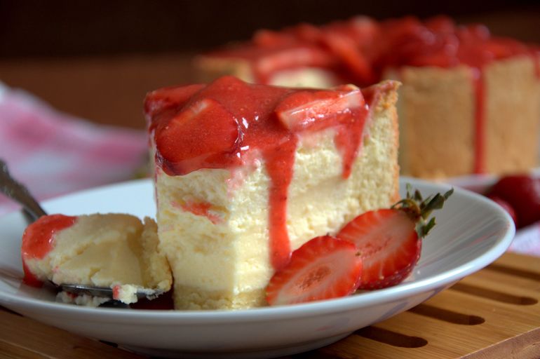 По этому рецепту чизкейк получается невероятно вкусным! Основа состоит из мягкого, песочного теста, которое дополняется цитрусовым ароматом и ванилью, на этапе замешивания теста, оно чуть было не сьедено моими домашними уже в сыром виде, настолько вкусные запахи источало. Начинка получается нежнейшая, воздушная и кремовая, отлично дополняется душистым соусом из клубники.