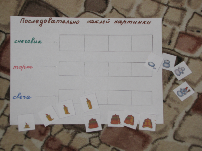 Нужно было последовательно наклеить картинки со снеговиком, как сгорает свеча и уменьшается торт.
