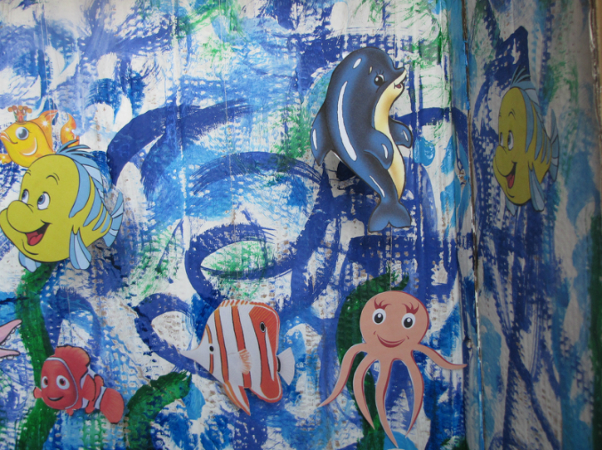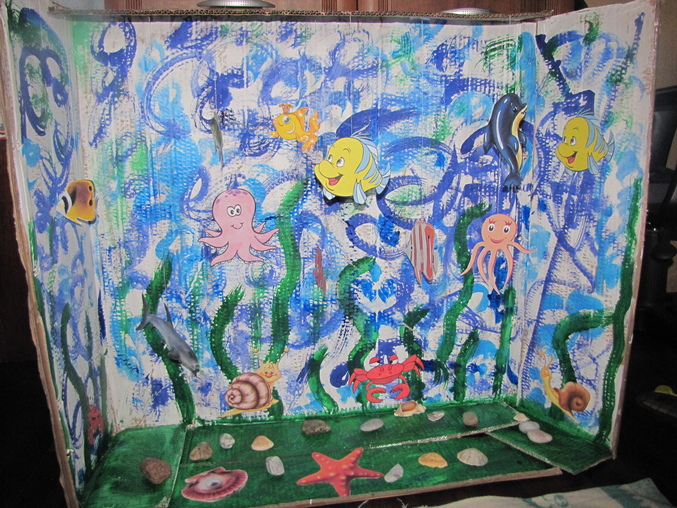 Рыбок, улиток, крабов..все распечатала на плотной бумаге, вырезала. Немного наклеила на стенки, а большую часть мы с Матвеем подвесили на серебряные веревочки, чтобы они у нас были в свободном плавание))))