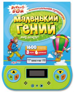Маленький гений. Мир вокруг - это электронная книга-викторина. В книге содержится 800 вопросов, разделенных на 6 уровней сложности. Для ответа на вопросы и проверки правильности используется мини-компьютер, расположенный в нижней части книги.