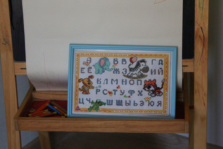 Если посмотреть еще левее от шкафа, то на икеевском мольберте можно рассмотреть рамочку с вышитым алфавитом))))
