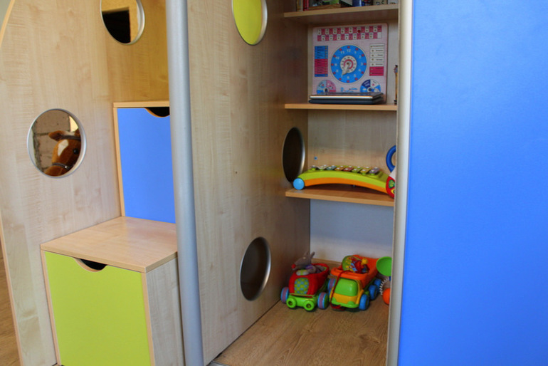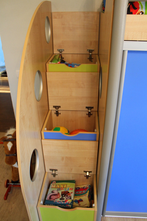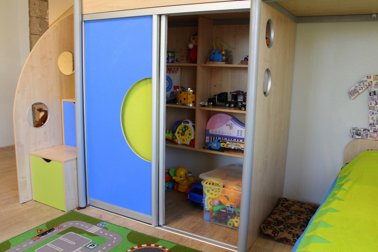 Со стороны ступенек есть в шкафу отверстия, они же "Гаражи", где хранятся у них небольшие машинки. Ни чего не пропадает даром)