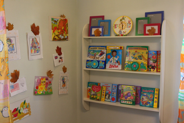Справа полочка для больших музыкальных книг, которые не удобно хранить на обычных полках с обычными книгами, да и не за чем им быть обычными! Это любимейшие книги детей! Иногда их даже не нужно брать в руки - подошел, нажал кнопочку и наслаждайся любимой песенкой, стихотворением....