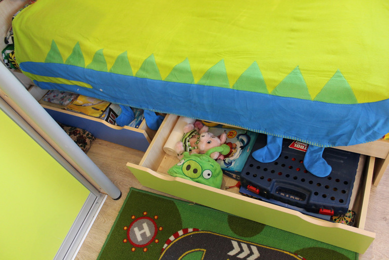 Внизу у кровати есть 2 вместительных ящика. в одном большие игрушки в коробках, в другом 3 сменных комплекта белья, пара пледов и пеленки на всякий случай)