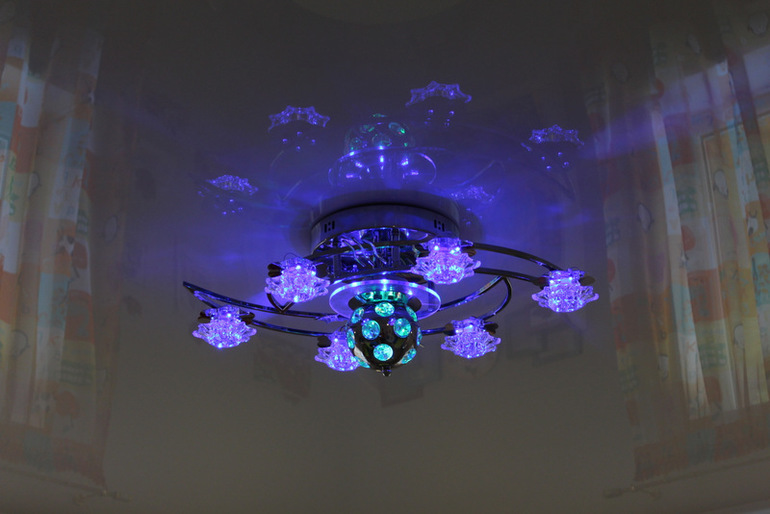 Потолок натяжной глянцевый. Очень красиво) Зря я его раньше не рассматривала. Уровни и цветастости на потолке не для меня, люблю просто белый гладкий красивый потолок, хотела украсить его красивым светильником, детским, но сломала голову просто над вопросом ГДЕ ЕГО ДОСТАТЬ! Выбор очень маленький, а цены нереальные! Ну да фиг бы с ними, я бы заплатила 5-6 тыс. за красивую люстру, но выбирать абсолютно не из чего!