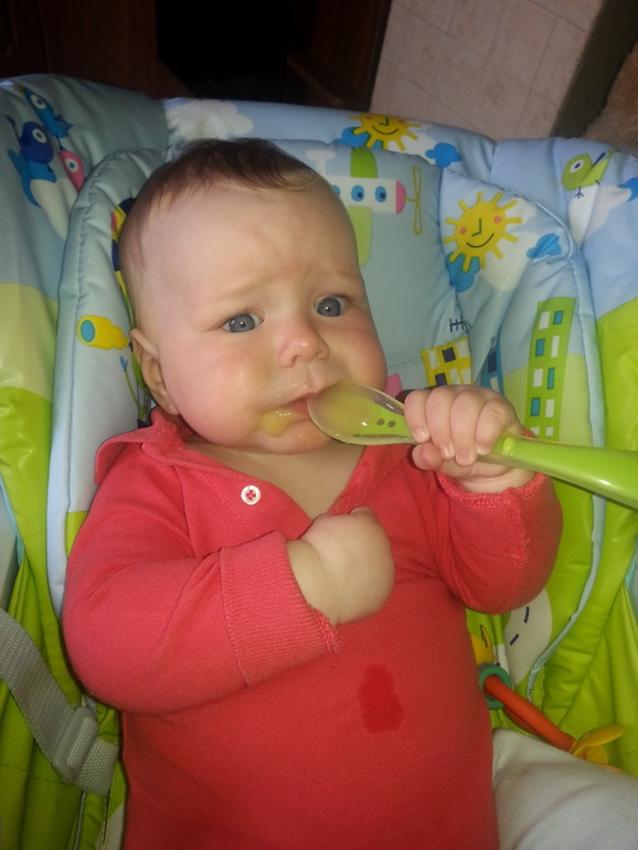 18.05 мы попробывали кабачек сразу пол баночки "спеленка" ему очень понравилось. держит ложечку сам, все ручки и все лицо перепачкали, а как же вкусно)) чуть-чуть до 6 месяцев не дотянули 4дня))