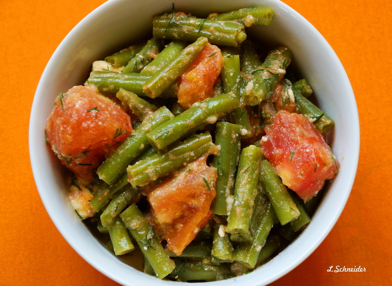 - Фасоль отправьте к помидорам, перемешайте, добавьте соль и перец.