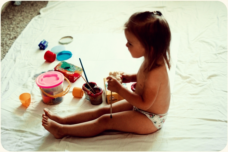 Застелила палас тряпкой, подготовила кисточки и краски, ватман (я склеила 6 листов формата А4). Ульяна сразу заявила, что на ножках и ручках рисовать не будет.