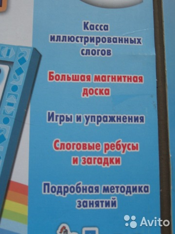 В состав набора входит магнитная доска, касса из 72 слогов с вынимаемыми вкладышами, кубик и инструкция, в которой подробно и понятно описаны методика занятий и правила игр.