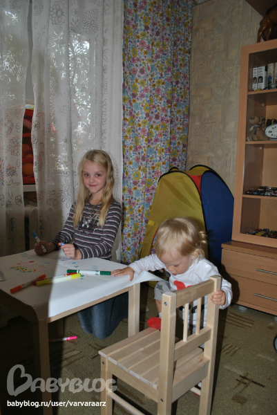 С соплями и покашливанием. Нет бы хоть на улице погода была хорошая, гулять бы ходили, а там.... бяка одни словом. Уже не знаю чем ее занять, рисуем, читаем, все надоедает быстро. Пойдем пирамидку пособираем, тоже ненадолго..... Телек и мультики мы пока не смотрим и не хотелось бы начинать.... Посоветуйте чем занять ребенка дома? Для нас это так дико... Мы раньше дома только ели и спали можно сказать..... Хорошо хоть в воскресенье купили в икее стол и стул для Вари, с ними как то веселей) Надо будет только довести до ума. Покрасить их.В субботу ходили на фотосессию с Варварой и моей сестрой Александрой. Фотки получились... волшебные просто! Полностью будут готовы примерно через недельку. Жду с нетерпением их))) И еще жду с нетерпением прошедших соплей и хорошей погоды....