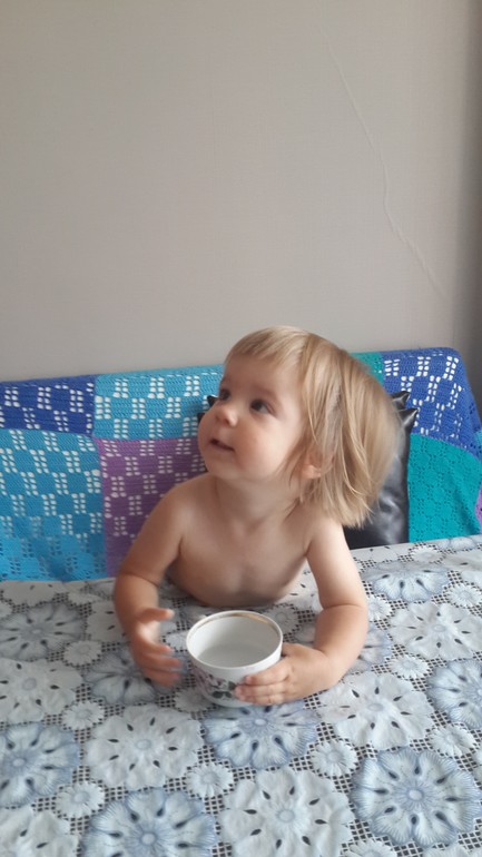 К дневному сну пока что приучить не выходит. В день у нас выходит два подгузника. Один - на дневной сон и один на ночной. На улице тоже может описится, но пака тепло - пусть, а потом посмотрим. Слово "пись" обозначает и "пипи" и "кака", а также кушать и пить. В словарном запасе появились новые слова, такие как "ми" - мишка🐻, "чита" т.е. обезьянка. Света очень ласковая малышка.
