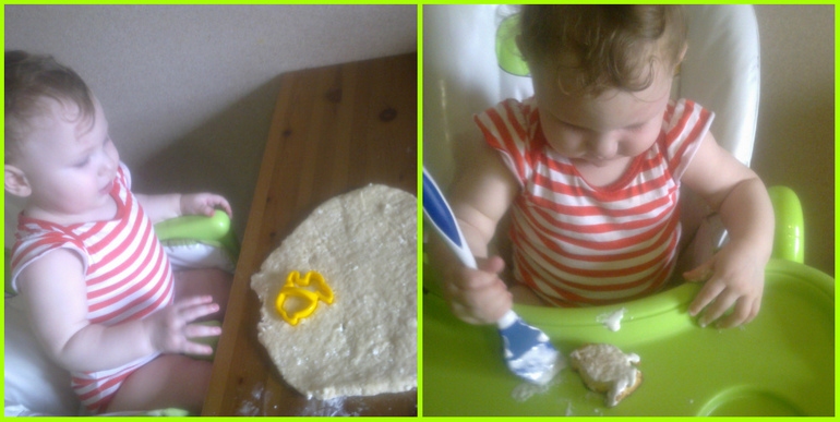 А еще она была детскую посудку, ту самую из которой поили куклу. Я посадила ее прямо в раковину , открыла воду и дала губку. Счастью не было предела. Наплюхались от души. Ну и в заключении пекли печенье "Пасхальные зайчики".Катюшка опять от души повозюкалась с тестом. После того как печенье испеклось его нужно было покрыть безе