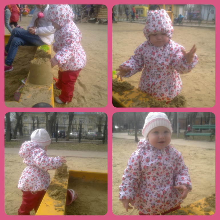 6 мая Катюшке исполнилось 11 месяцев! Еще один месяц и моя малышка уже будет совсем большая. С развитием у нас все в порядке, хотелось бы чтобы чуть больше говорила , но уже и сейчас она радует нас своими словечками. Возьмешь что-нибудь в руки, а она еще даже не видела что, а уже надо забрать, тянет руки кричит НАНА,НАНА… и попробуй не дай. Характер атас. Всегда думала что детки только не воспитанные истерят , если что-то не так, а тут вроде с воспитанием все в порядке, но если Катюша что-то хочет, то получит незамедлительно. На пол пока не падает, но похоже это будет. Если Катя сидит играет, а я например хочу ее взять и унести на кухню поесть, то когда я ее поднимаю она кричит и спинку прогибает. А может все пройдет, кто его знает. Сейчас Катюшка приболела, у нее правосторонний отит. В последнее время деньки стоят теплые, но ветряные. Я ей капюшон надеваю, а все равно зацепило. Сейчас сидим дома с температурой. А вообще погулять мы любим и попробуй зайди в подъезд если Катя не нагулялась. Из коляски не вытащить, сразу будет ситуация описанная выше. Вот наши гули-погули: Песочницу мы полюбили с первого взгляда, но все игрушки там наши и по другому быть не может, если нет , то см. выше как говорится. Можно поменяться, на это пока идет.