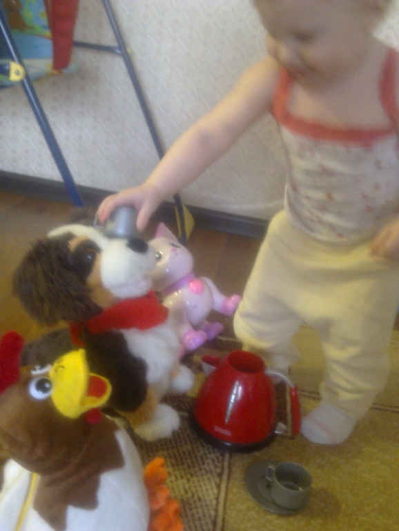 Все продукты были подготовлены ,Катюша все перелаживала из емкостей , очень ей понравилось возиться с тестом. После того как шарлотка испеклась мы проводили эксперименты, а точнее сказать просто наливали в чашки воду и смотрели карточки: ГОРЯЧАЯ-ТЕПЛАЯ-ХОЛОДНАЯ. Все потрогали.Горячую конечно только чуть-чуть прикоснувшись рукой с чашке. Но мне кажется она все поняла. Далее заваривали чай. В чашку с горячей водой опускали чайный пакетик и смотрели как чай заваривается. Потом я произвела подмену на более холодный чай и мы поили чаем нашу дочку Алину,покормили ее вареньем и пошли мыть в ванную. Весь процесс помывки куклы сопровождался английской речью. Потом играли с воображаем чаем и напоили оставшихся наших друзей. Вообще она любит так играть. Видимо смотрит на старшую сестру и понимает что можно играть не только с настоящими предметами,но и с выдуманными. сама активно принимает в этом участие и пьет чай как по настоящему.