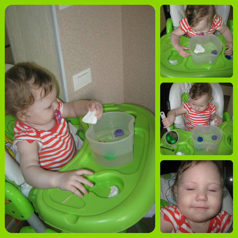 Пока занятия продолжаем, а там посмотрим. Есть ведь еще Никитин или методика Зайцева например. ГОВОРИМ С ПЕЛЕНОК. Здесь мне все нравится. Диалог конечно у нас своеобразны, но все же есть. Например: Я: МО-МО-МО любит мама эскиМО Катя: МММмм Я: МУ-МУ-МУ крепко маму обниМУ Катя: УУУуу Очень нам нравятся игры из дневничка, играем почти во все. Игры с водой это конечно хит №1, играет долго. Сегодня играли в игру «Кидаем предметы». Если решите повторить, то для игры вам понадобятся: емкость с водой, предметы сделанные из разных материалов, с разной плотностью и весом для того чтобы показать что некоторые предметы тонут в воде, а какие-то нет. По очереди опускайте с малышом предметы в воду, наблюдайте и рассказывайте, что происходит.