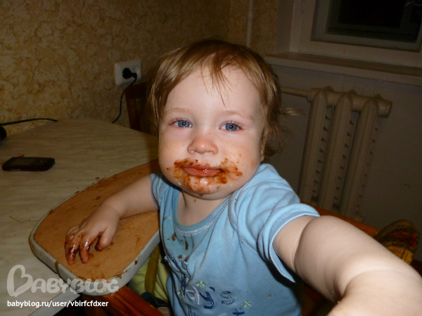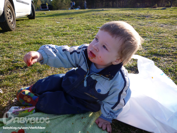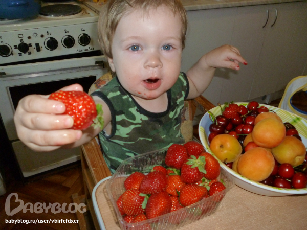 И у нас наконец-то появились ягоды- Сашка пробует первый раз:)