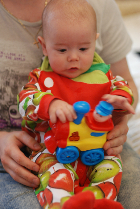 Ну наконец-то слышу МА-МА!! постоянно мамакаем :) Вобще, разительно вырос за неделю. Постоянно кричит басом ЭЭЭЙ, Дай-дай! Дя-дя, бебе, баба, дада, мама, меме, му. Просыпаемся с мужем от того, что он подползает к нам под бочок и пытается прилечь под крылышко, при этом кусается:) Любит целовать меня-всю оближет, вечно в слюнях хожу. Причем целует во весь рот только меня:) ОООчень любит, когда я его щекочу волосами и целую животик. Улыбка вечно во весь беззубый рот (зубов пока не видно и в помине), а вот смех в голос из него выжать оооочень сложно и то ненадолго!! Кушаем капусту, брокколи, тыкву, морковь, яблоко, персик, творог, банан, каши. Пьем чай и кисломолочную Агушу. ЕДим раз в три часа. Последний раз в два ночи и утром в 8-30. Стул наконец-то наладился-УРРА! Любит карабкаться везде. Я сажусь на полу около дивана, он по мне лезет на плечо (при этом кусая и слюнявля меня), залазиет мне на плечо, с плеча-на кровать, с кровати попой слазит на пол и по-новой на меня :) Игрушки свои разлюбил- обновляем. В ванной купать невозможно! встает на ноги, выкарабкивается из нее и все хватает. А еще папа научил его плевать слюни- один раз показал и всееее.... весь день пфукаем и плюемся! Усиленно пытается уснуть на животе. Смешно выглядит. СПит- переворачивается на живот и начинаееется.. с закрытыми глазами ползет и пытается лечь поудобнее, то на подушку, то на меня, но никак на животе не уснет.. вот и бродит, пока хныкать не начнет, тогда я его на спину кладу. Засыпаем сами, не на руках, без укачиваний, главное условие - песня "Колыбельная Умки", либо в моем исполнении , либо в записи. Моментально засыпает. На руках не лежит и не сидит, укачивать не дает, постоянно пытается сесть, даже когда грудь кушает. Сядет и пытается есть, а я прям как акробат выкручиваюсь :) Полюбил Ладушки, бьет своей ладошкой об мою, о двумя своими ручками не понимает пока. Когда слышит Ладушки аж трястись начинает и визжать!! Нормально ползать так и не начали, все прыжками, но ооочень быстро, особенно если впереди цель ввиде моей чашки-пульта-телефона. Под катом фото.
