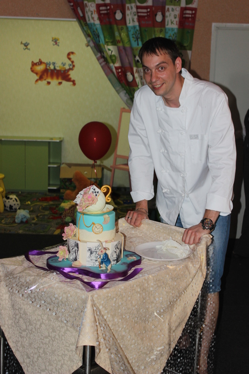 Ближе к завершению ,под звуки фанфар, в зал выкатили тортик! Его идею я так же нашла в интернете, только изменив расцветку на ту которая бы подходила и для мальчишки и для девочки , ну и добавив немного от себя)))Свечи я на него лепить не стала,посчитав лишним.