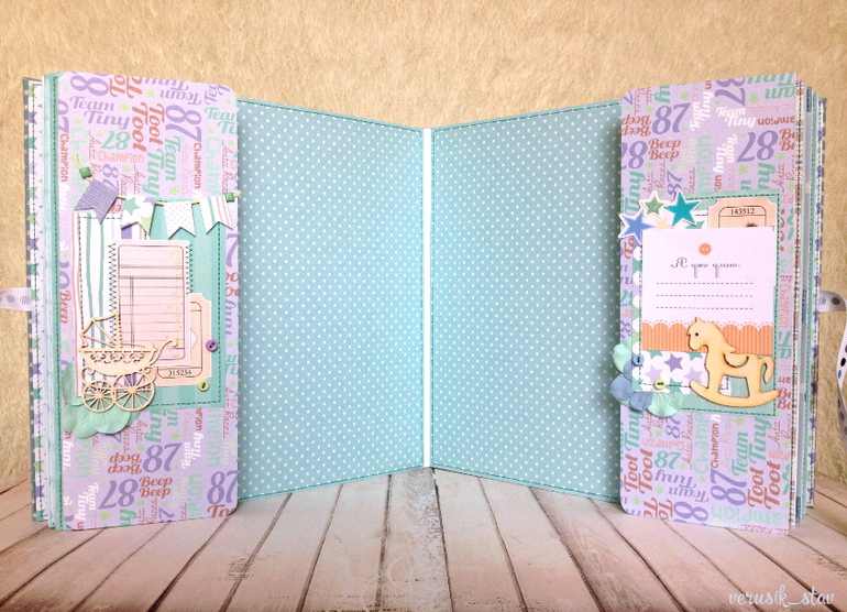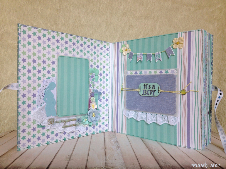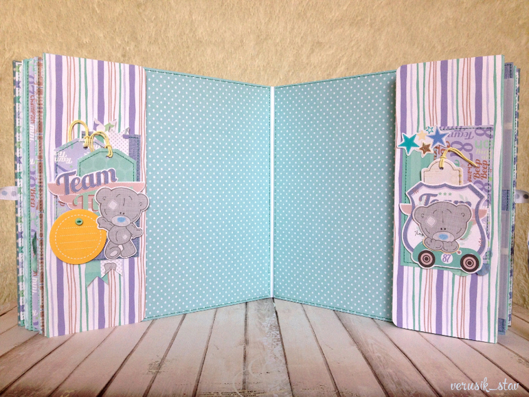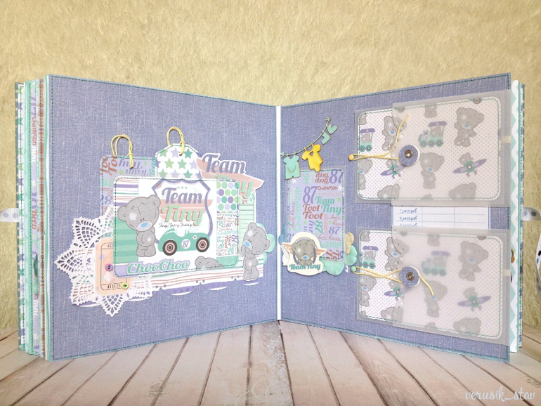 Второй разворот с открывающимися карманами. И многодетальным декором с мишками.