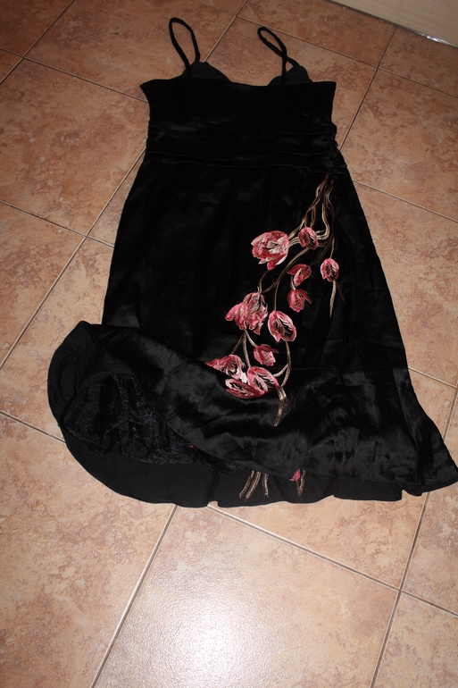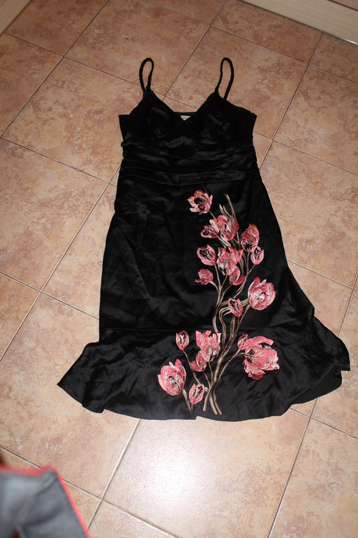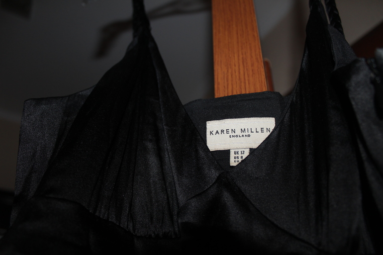 1. Платье KAREN MILLEN. Английский 12 размер (наш 46). Черное атласное. Покупала к подружке на свадьбу, одела 1 раз. Извините за фото, платье неглаженное (достала из вакуумного пакета). Внизу подклада пришит маленький подъюбник пышненький, смотрится платье классно, впрочем как и все платья этой марки. 800 руб. (в магазине платья этой марки сейчас достаточно дороги)![]()