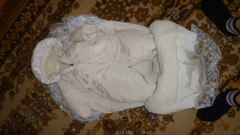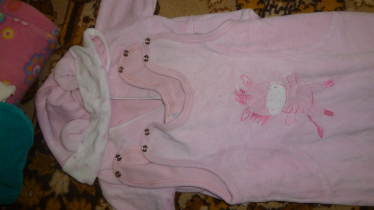 Тоже 350 руб. Он мне кажется универсальный, и на полгодика будет хорошо и на 1.5 просто сидеть будет по разному. Вот также на маленькую ножку пинеточки беленькие в цветочек, под платьице идеально. Бодик зебра славненький, там в области попки рюшки смотрится супер. Костюмчик розовенький на весну комбез и кофточка с капюшоном. И костюмчик бежево-золотой очень интересный с шапочкой идет. Самые мои любимые вещички.