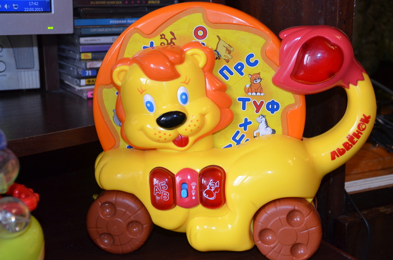 крутишь круг, хвостик льенка -это как бы стрелочка ,играет музыка и он говорит либо буквы либо звуки животных, на которых указывает хвостик