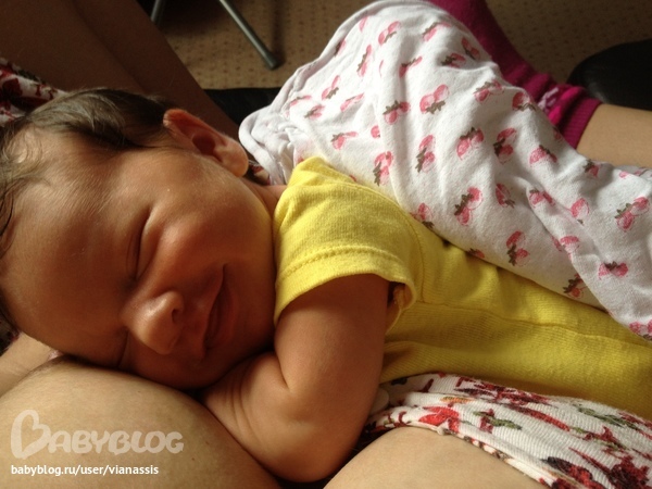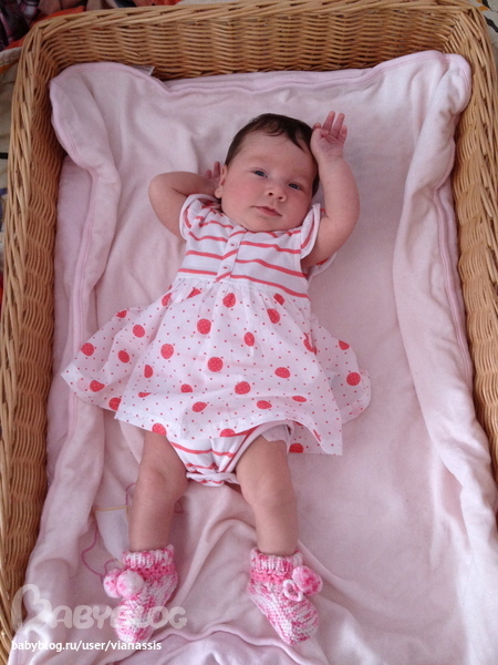 Доченька наконец стала осознанно реагировать на голос и разговоры,теперь ее можно успокоить интонацией и болтавней :-)! Режима пока нет особого, так как животик может мучить в разное время, сбивается сон и прогулки! Обожаю с ней спать и возиться целыми днями!!! Ужасно невысыпаюсь и хочу ооочень сладкого илихотя бы печенья!!! Дальше фото, вылитая папа :-)