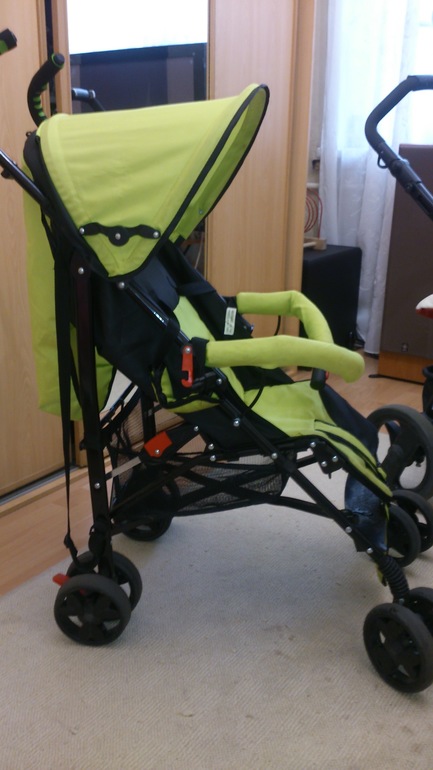 С ней могу отдать коляску трость, ей пользовались более активно, есть дефекты - не хватает кнопок на перемычке между ножек, ручки не в очень хорошем состоянии. В принципе это все можно исправить. Спинка раскладывается, кап опускается до бампера даже в разложенном положении.
