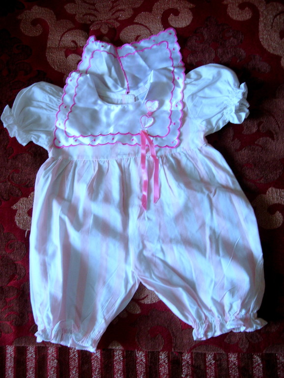 Комбинезон привезен из Голландии белый в розовую полоску, рукава фонарик, брючины на резинке, широкий атласный воротник лента, аппликация