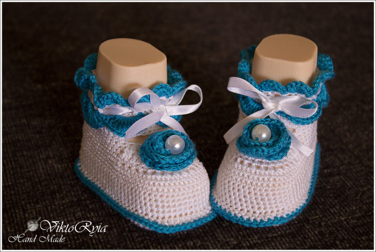 В дополнение к платью связала в подарок крошке вот такую повязку и пинетки. Так как посылка уже благополучно дошла, могу показать)