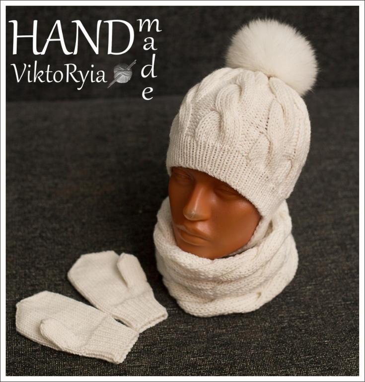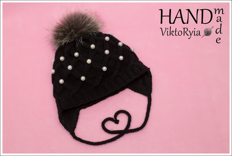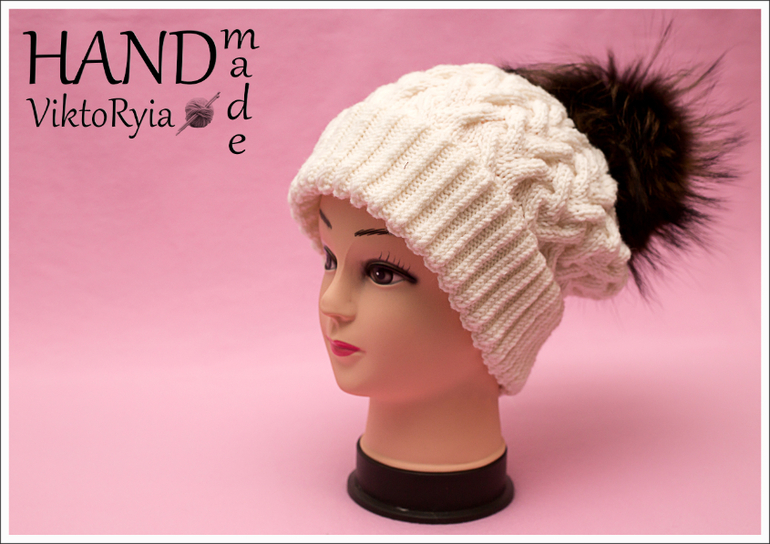 Материал полушерсть. Спицы№ 3,5 и 4,5. Внутри подшита флисом. Помпон из натурального меха, крепится на булавочке