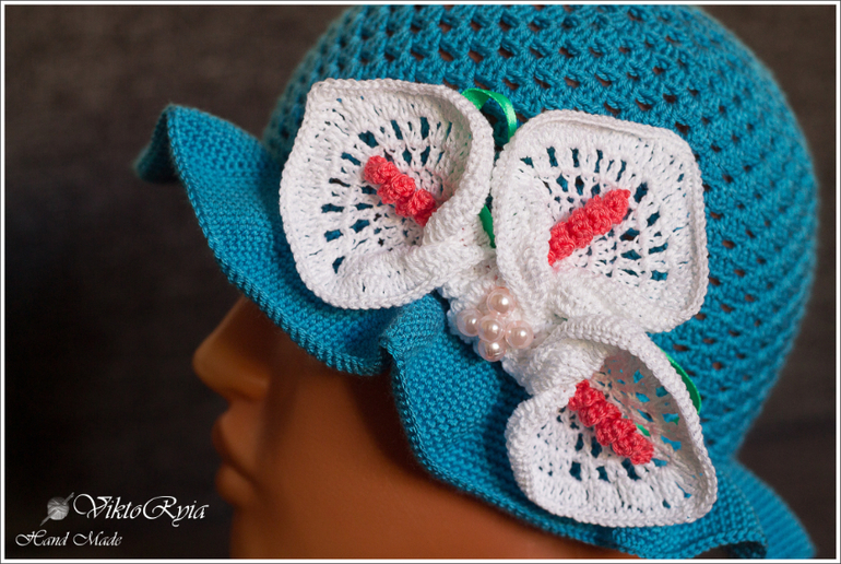 Решила и я попробовать связать каллы на шляпку, точнее на панамку
