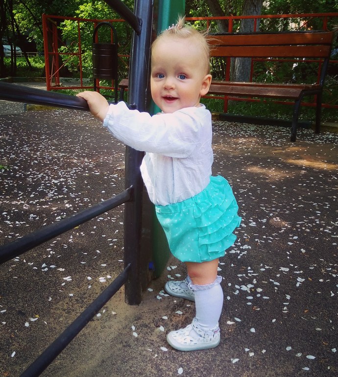 Моей королеве 1 годик🌟 ходим за ручку. Стоим с 9 мес. Уверенно идем на корты😛 и обратно без опоры. Очень общительная. Хохочет, когда с ней взаимодействуют дети.