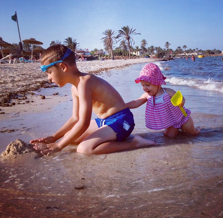 Малышка с нами побывала в Испании. Сын там учился в летней школе . Интенсив английского. Море Марина не боится , наоборот лезет в него. Переболели ангиной -маленький кошмар наш. Потом мы улетели в Тунис на о. Джерба. Провели 2.5 недели и в Москву.
