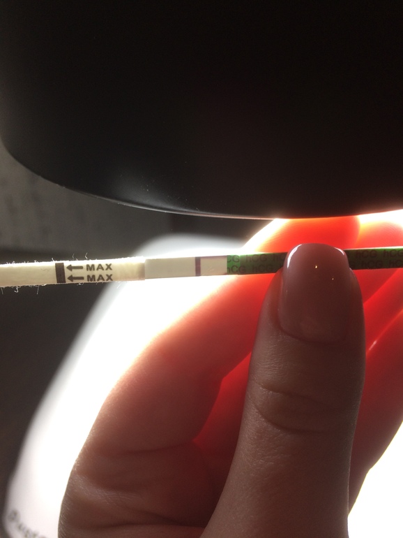21.12 был 2 день задержки, утром сделала тест, визуально он с одной полоской, но если посмотреть под определенным углом , то видна бледная едва заметная вторая полоска.
