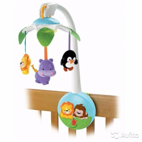 Fisher-price Музыкальный Мобиль «Живая планета» легко крепится на кроватку, Три подвески - львенок, пингвин и бегемотик, крутятся, когда играет мелодия. Чтобы музыка начала звучать, достаточно покрутить солнышко. Пока это будут делать мама и папа, а малыш, когда чуть подрастет, освоит это нехитрое дело и сам.