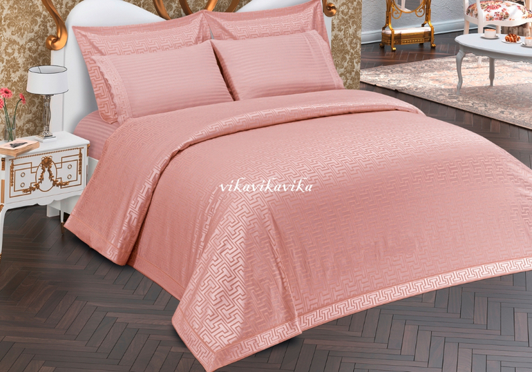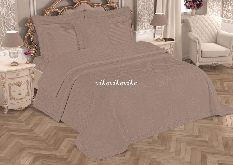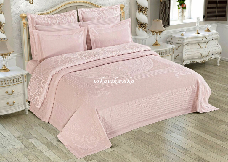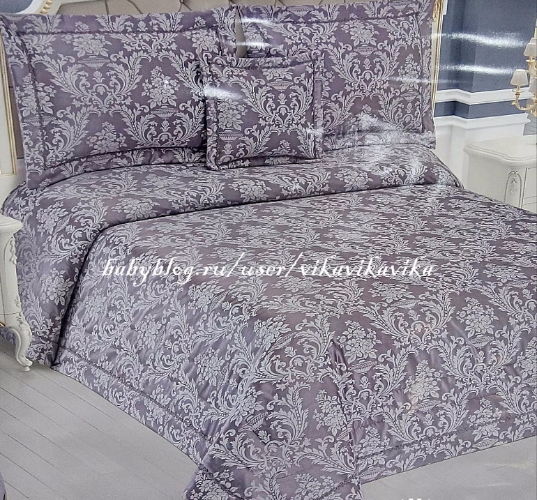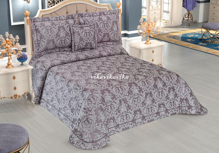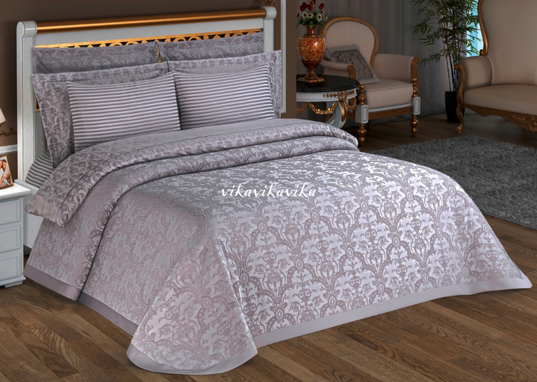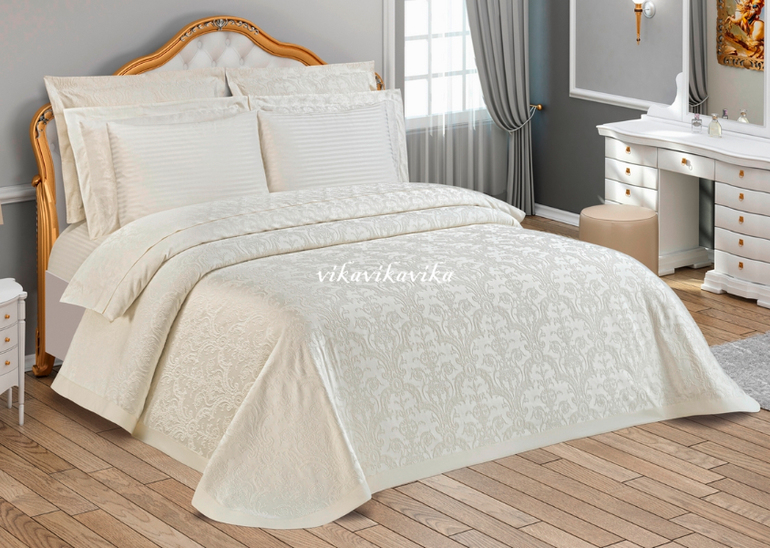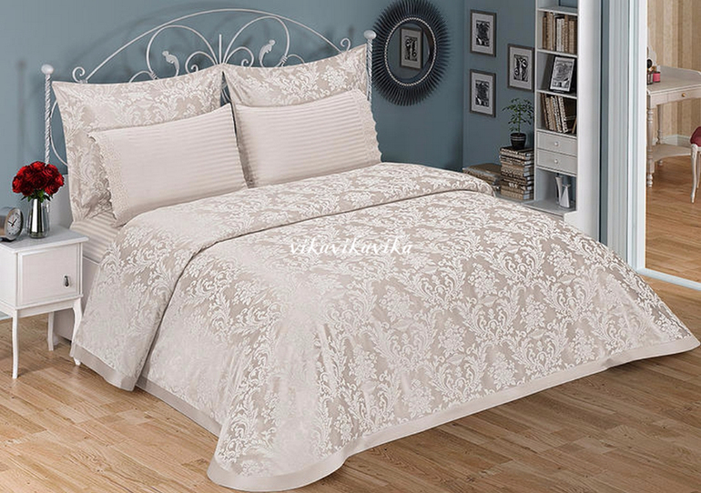 Шикарный комплект из покрывала, простыни и 4-х наволочек на подушки(50х70 см). Шелк-жаккард Французской Торговой марки MD, это - премиум-линейка изделий для спальни, которое сделает любой интерьер более изысканным, а ваши ощущения во время сна - поистине фантастическими. Богатый жаккардовый рисунок в Европейском стиле. Декоративная вязанная отделка по периметру покрывала и наволочек. Размер 260х260 см - великолепно подходит на Евро и 2-х спальную кровать. Дополнительно покрывало красиво складывается на кравати, как показано на фото. Простынь 240х260 см. Роскошь и современность в одном!