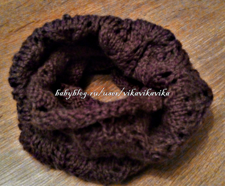 МОИ ВЯЗАЛКИВчера связала снуд в цвете горького шоколада с ажурными листиками, получился воздушный, мягкий и теплющий (100% мягкая неколючая шерсть высшего качества), без натяжки в ширину 28 см, в длину 32 см.