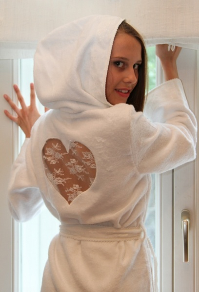 Уютный и стильный, современный халатик с капюшоном в изысканном Французском стиле. Нежная махровая ткань с добавлением бамбуковой нити. Изысканная отделка нежной и цветной сатиновой тканью всего пояса. Скругленные полы халата с разрезами по бокам. Полы халата, капюшон и рукава украшены кружевной бейкой. И Хит этого сезона - вырез на спине в виде сердца, прикрытый прозрачным кружевным гипюром, украшенным нежными розочками!