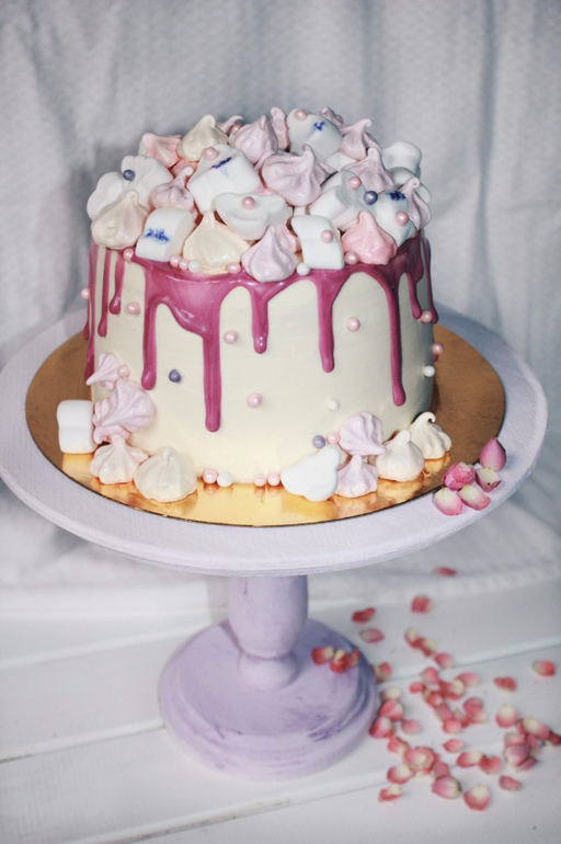 с ванильными бисквитами Королевы Виктории, пропитанными карамельнм сиропом с прослойками из припущенной вишни. Покрыт ванильным крем-чизом и ганашем из белого шоколада. Сверху домашнее безе и маршмеллоу.