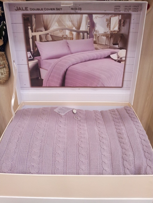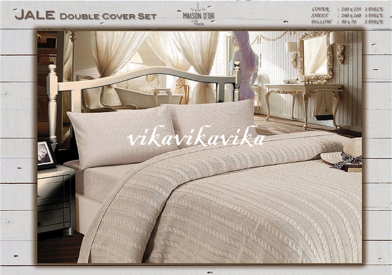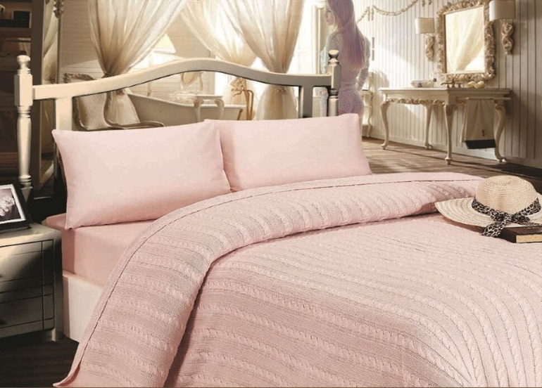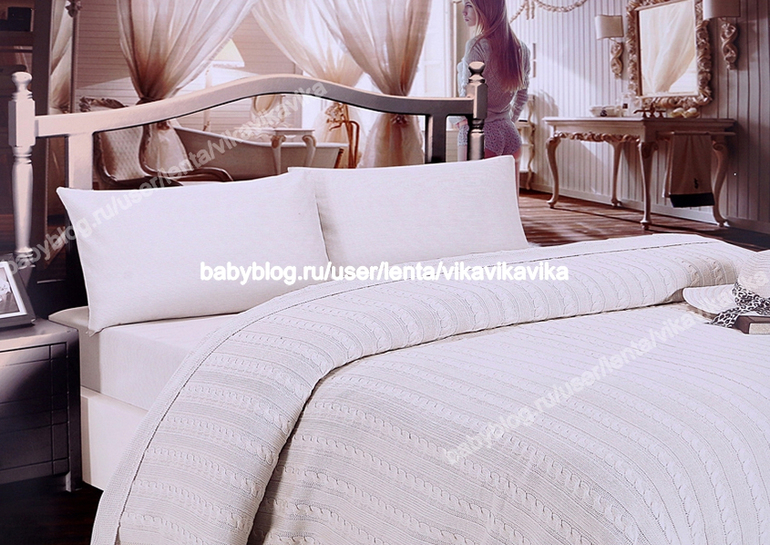 №17 Комплект из сатина: покрывало вязаное из хлопка, простыня и две наволочки