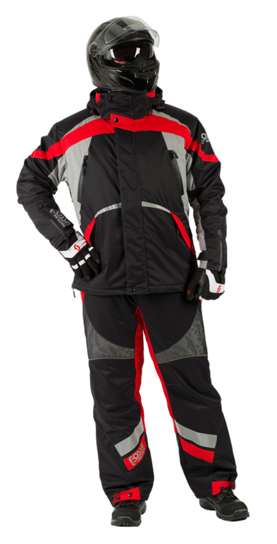 Костюм состоит из многофункциональной куртки и полукомбинезона - трансформера. Спортивная экипировка представлена в динамичном цветовом сочетании черного, красного и светло - серого.