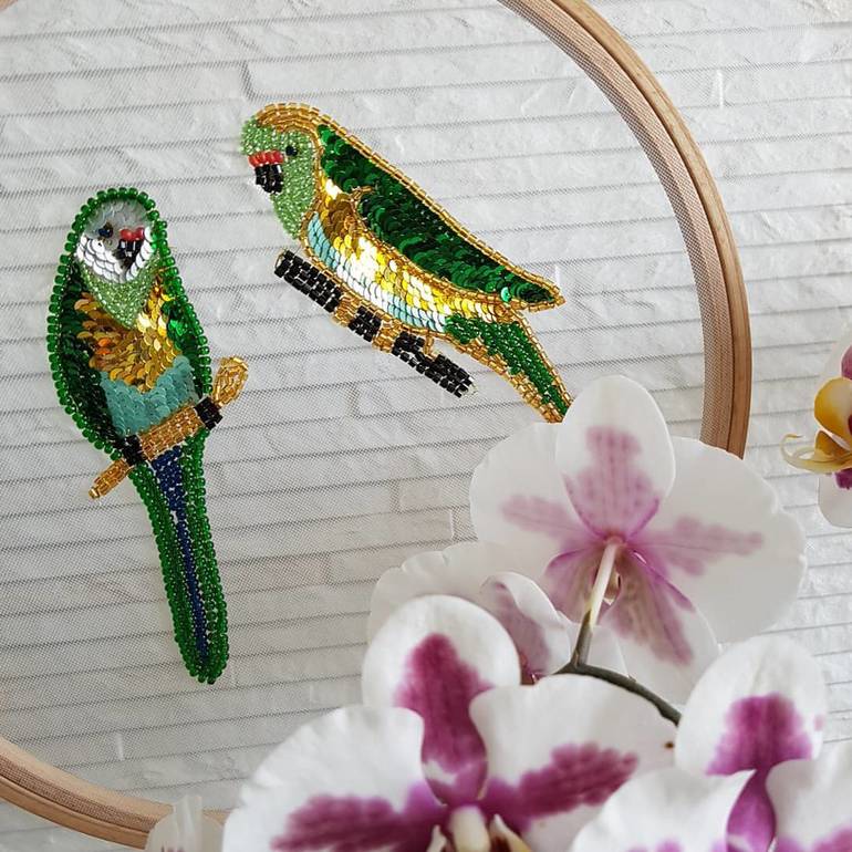 Вышились люневильским крючком два вот таких попугайчика. Технику осваиваю сама, по этому, конечно, не идеально. Думаю отправить их жить на джинсовые шорты, или в брошки оформлю.