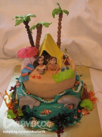 5. Торт : заказала,полностью будет подходить под тематику, пляж,фигурка мужа,дельфины,море,пальмы)))