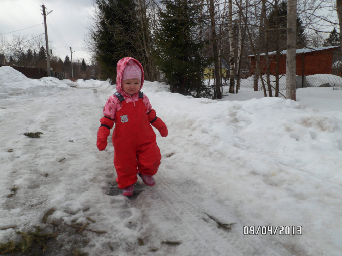 Сегодня первый раз пошли гулять в весеннем одеянии, резиновые сапоги не успели еще купить (НО!!хочу отметить, что зимние демары вообще не промокают!!!!Вика прошлась по всем лужам, сапоги были полностью мокрые, а ножки сухие и теплые!!!)