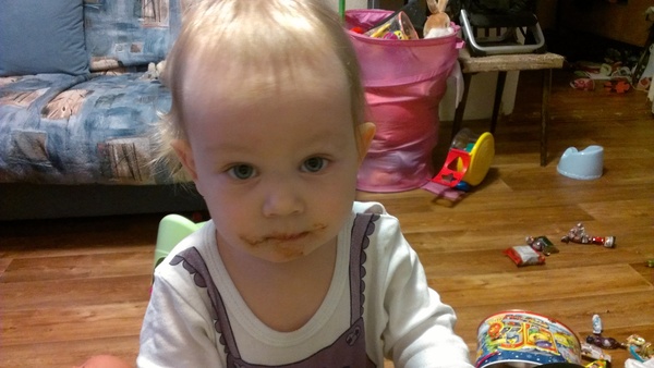 Вот у нас дочка с ёлки привезла большой подарок,так не досмотрели и мелкий стащил конфеты,и с удовольствием трескал!