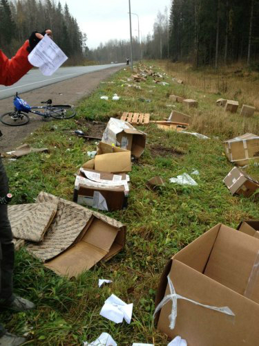 Видимо сегодня ночью, на нейтральной территории между Фин и Россией перевернулась почтовая фура. На протяжении 300 метров обочина усыпана пустыми вскрытыми коробками DHL и почты Финляндии. Попадаются вскрытые коробки от MacBook Air, Macbook Pro, от различной электроники из инет–магазинов, рваные инвойсы. Получатели россияне. Вот так кто–то остался без макбука…