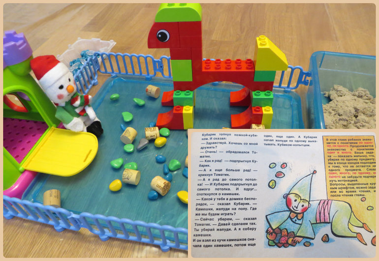 Про математическую сказку "Приключения Кубарика и Томатика" я рассказывала здесь. Сегодня покажу как мы разыграли Главу 1 "Откуда взялся Кубарик" плюс наши игровые занятия. Изучаем (повторяем) понятия один, еще один, много.